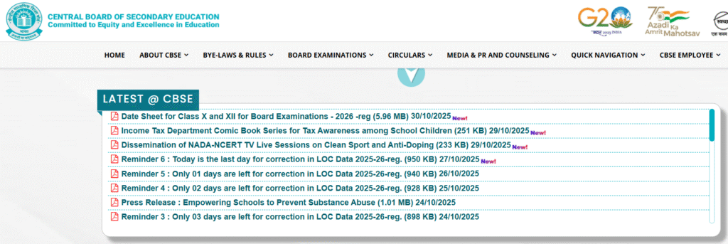Step 3: Find and click on the link titled “CBSE Board Exam Time Table 2026 – Class 10 and 12” or “Date Sheet for Class X and XII for Board Examinations – 2026 -reg (5.96 MB) 30/10/2025″
