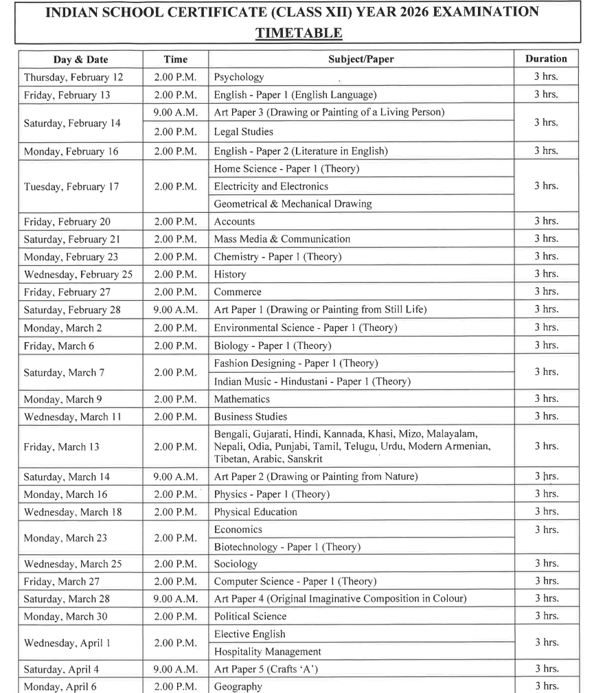 Indian School Certificate (Class XII) Year 2026 Examination Timetable