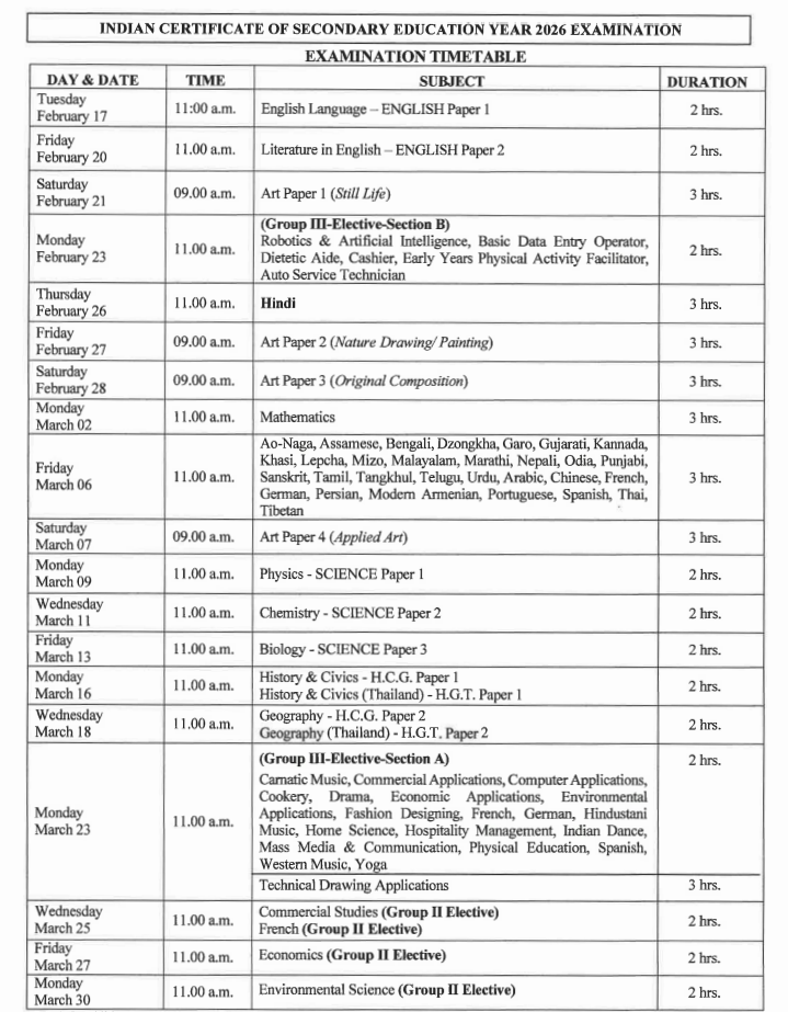 Indian Certificate of Secondary Education Year 2026 Examination Timetable