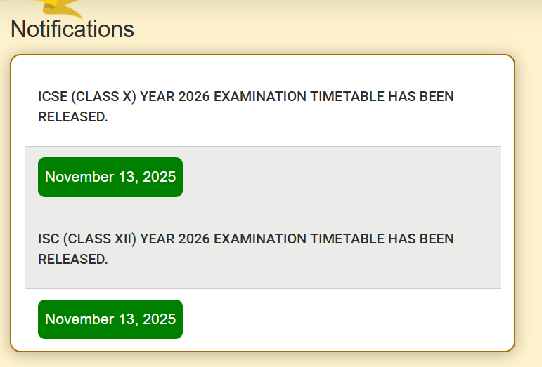 Step 3: Search and select the link that reads ‘ICSE Class 10 Date Sheet 2026’ or ‘ISC Class 12 Date Sheet 2026.’