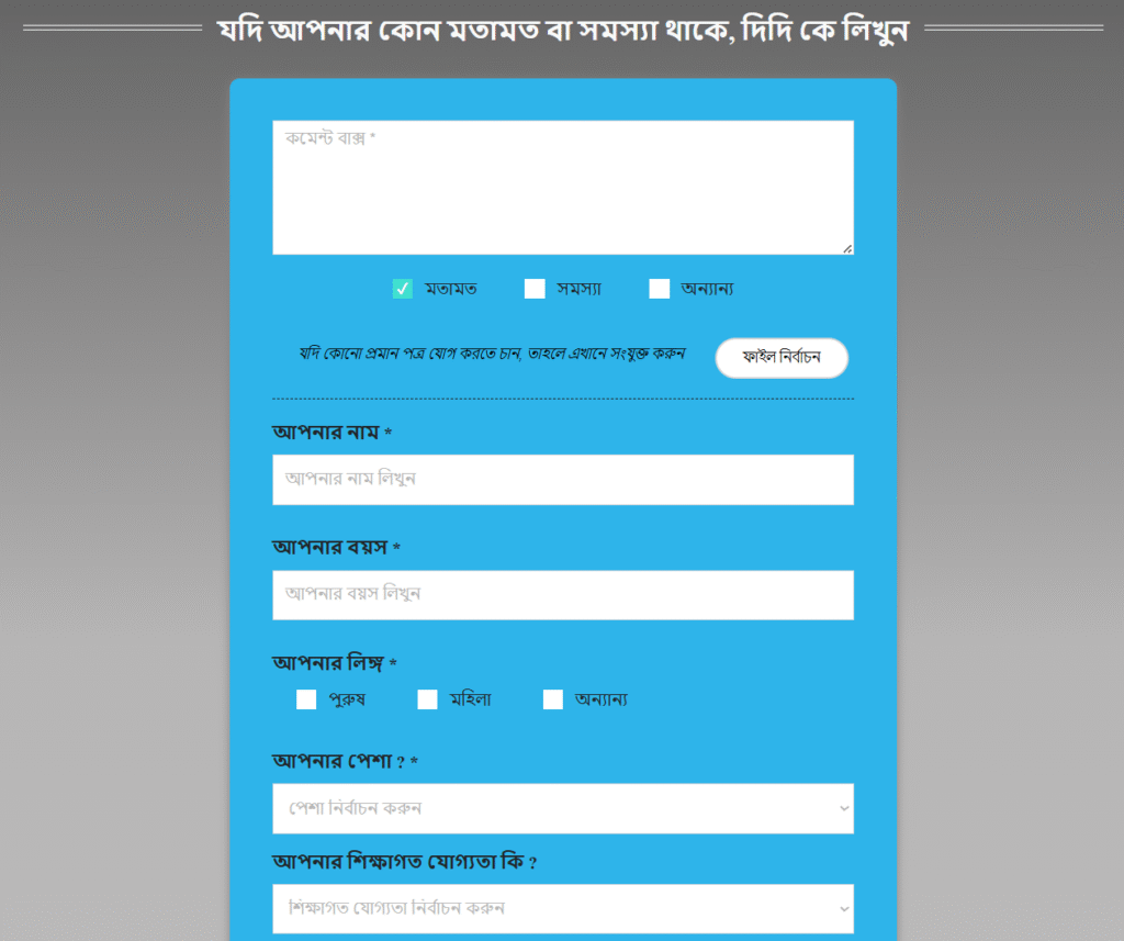 The All India Trinamool Congress launched the Didi Ke Bolo initiative, which gives West Bengal residents an opportunity to submit their grievances or concerns to Mamata Banerjee, the state chief minister and chairman of the Trinamool. To file complain or suggestion then go to Official Website of Didi ke Bolo i.e. didikebolo.com.