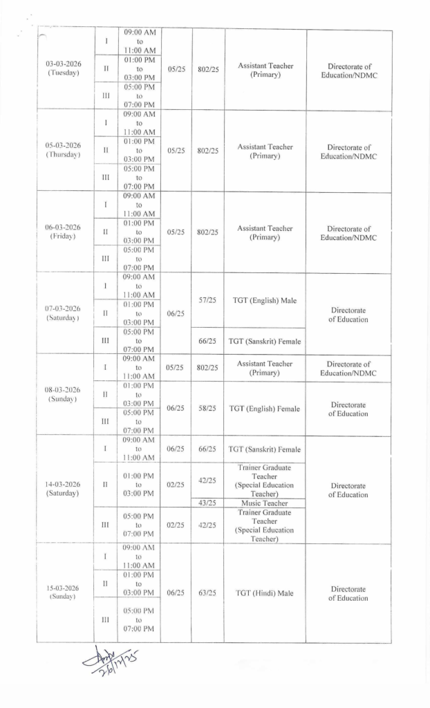 | TGT (Special Education Teacher) | 42/25 | 14-03-2026 | Shift II & III combined slots with Music Teacher, typically 01:00–03:00 PM and 05:00–07:00 PM |
