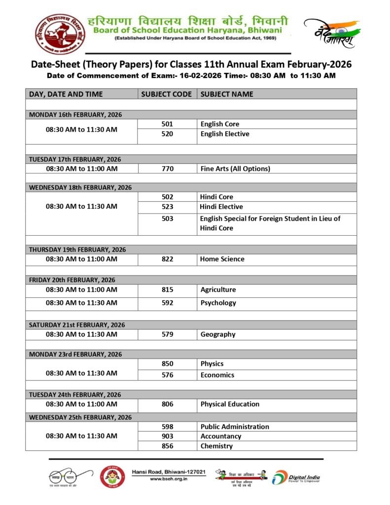 The HBSE Class 9 theory tests will take place from February 17 to March 6, 2026, while the Class 11 theory examinations are set from February 16 to March 13, 2026. Theory exams for main topics will be placed in the morning shift, from 8:30 AM to 11:30 AM. Optional and vocational classes run from 8:30 a.m. to 11:00 a.m.