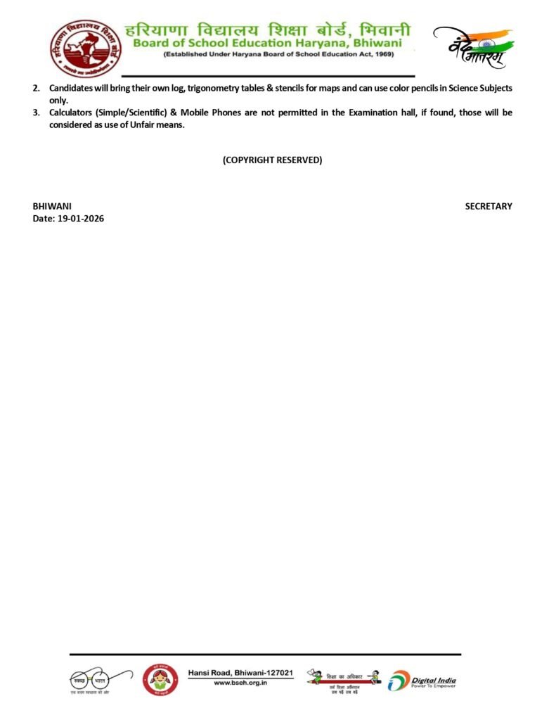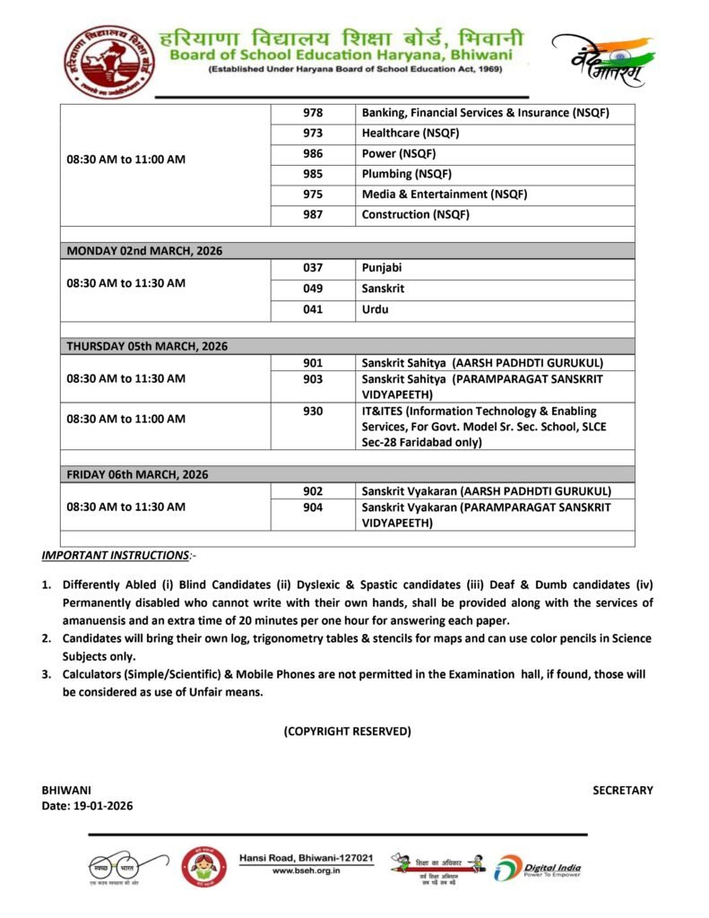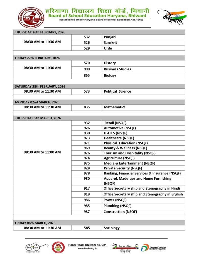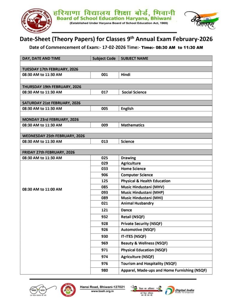 Students who wish to download the HBSE Time Table 2026 for Class 9 and Class 11 can access the official date sheet PDF through the Board of School Education, Haryana’s official website at bseh.org.in