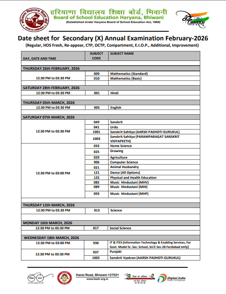 Haryana Board Date Sheet 2026, HBSE Class 10, 12 Time Table 2026: The Board of School Education Haryana (BSEH), Bhiwani, released the date sheet for the Class 10 and Class 12 examinations in 2026. According to the official schedule, the Secondary (Class 10) tests will take place from February 26 to March 20, while the Senior Secondary (Class 12) examinations will be held from February 25 to April 1. Both tests will be administered in a single shift from 12:30 p.m. to 3:30 p.m. each day.