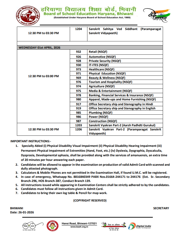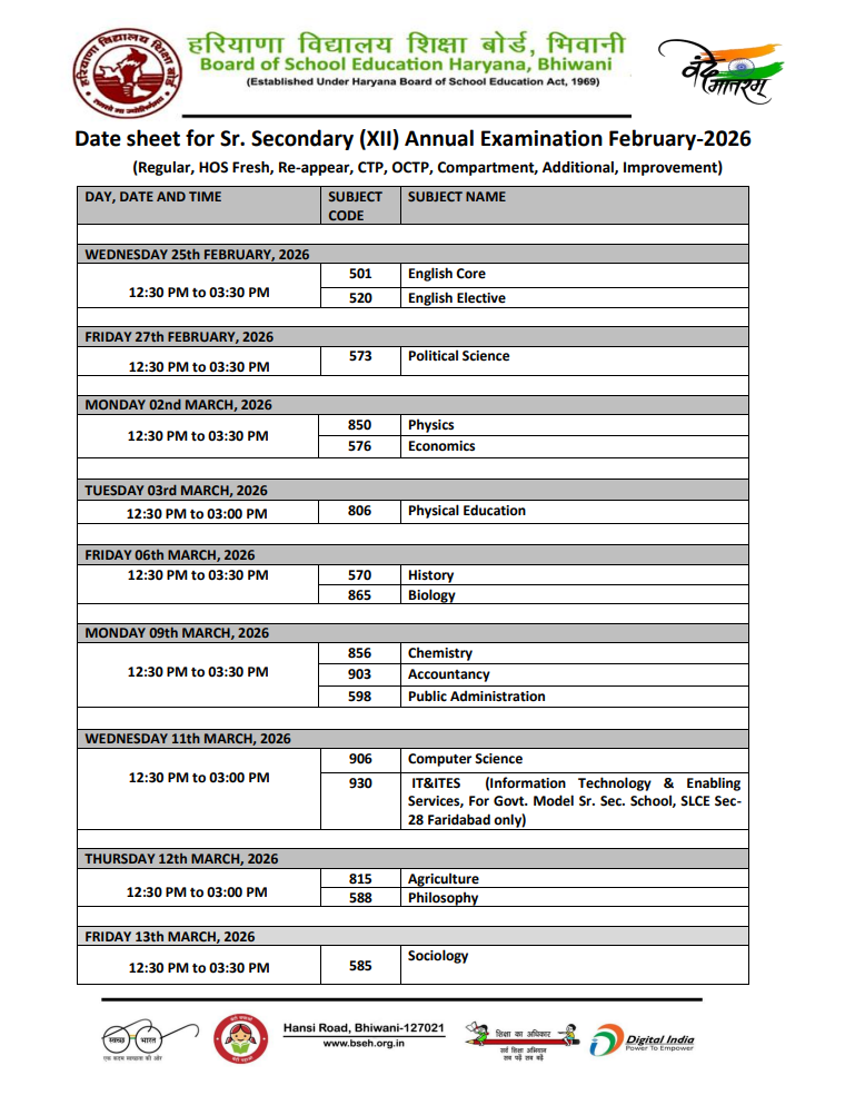 Haryana Board Class 12 examination 2026 Date Sheet