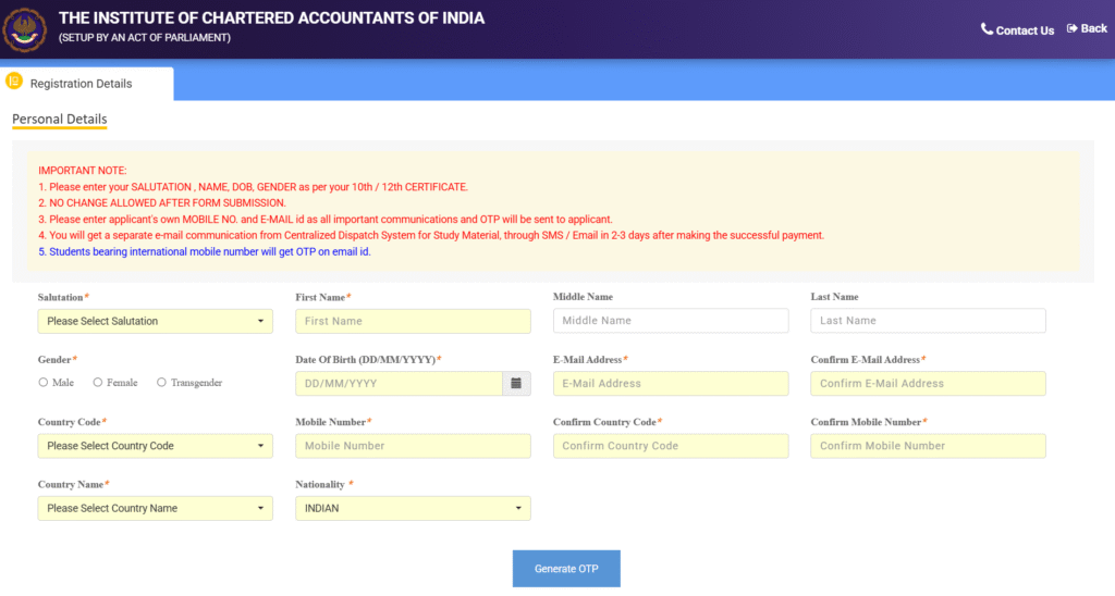 ICAI Portal Online Registration Form at icai.org