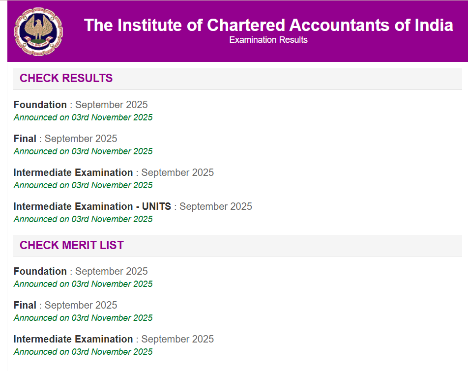 | ICAI Exam Result – September 2025 | Announced on 03rd November 2025 |