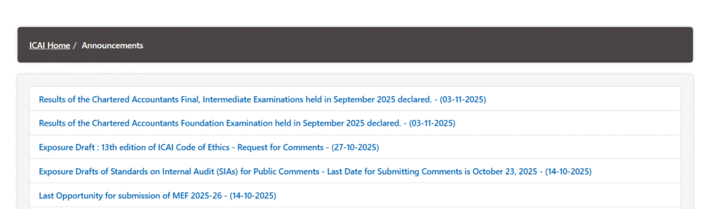Step 2: On the homepage, check the “Important Announcements” menu or Alternatively, visit the dedicated results page directly at https://icai.nic.in/caresult/.