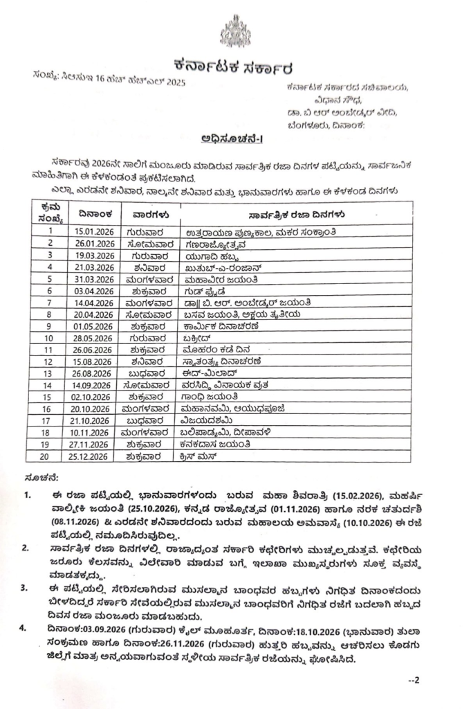 1. ಈ ರಜಾ ಪಟ್ಟಿಯಲ್ಲಿ ಭಾನುವಾರಗಳಂದು ಬರುವ ಮಹಾ ಶಿವರಾತ್ರಿ (15.02.2026), ಮಹರ್ಷಿ ವಾಲ್ಮೀಕಿ ಜಯಂತಿ (25.10.2026), ಕನ್ನಡ ರಾಜ್ಯೋತ್ಸವ (01.11.2026) ಹಾಗೂ ನರಕ ಚತುರ್ದಶಿ (08.11.2026) & ಎರಡನೇ ಶನಿವಾರದಂದು ಬರುವ ಮಹಾಲಯ ಅಮಾವಾಸ್ಯೆ (10.10.2026) ಈ ರಜಾ ಪಟ್ಟಿಯಲ್ಲಿ ನಮೂದಿಸಿರುವುದಿಲ್ಲ.