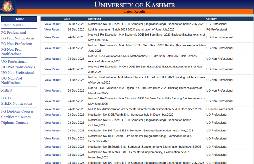 Kashmir University Result 2025: The University of Kashmir (UoK) is now officially starting the release of results for the 2025 academic session. According to the most recent announcements, the institution has issued the results for major undergraduate and postgraduate examinations held earlier this year.
