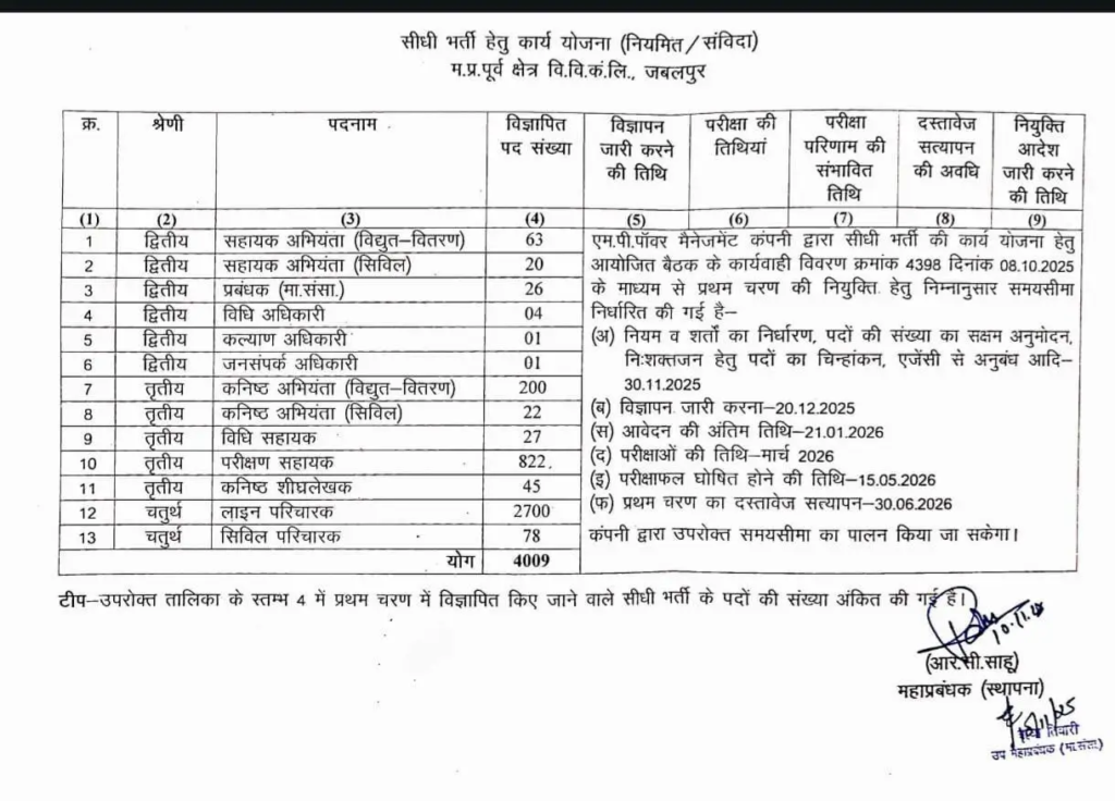 MPPKVVCL Recruitment 2026: MPPKVVCL, Madhya Pradesh’s major power distribution corporation, has issued a notification (Advertisement No. awaiting final updating on web) seeking applications for 4009 positions. The openings include important operational jobs like Line Attendant, Junior Engineer, and Assistant Engineer, as well as administrative positions like Law Officer and Manager (HR). Candidates must apply only through the official website, www.mpwz.co.in or portal.mpcz.in. The online application link will be open beginning December 20, 2025 and ending January 21, 2026.