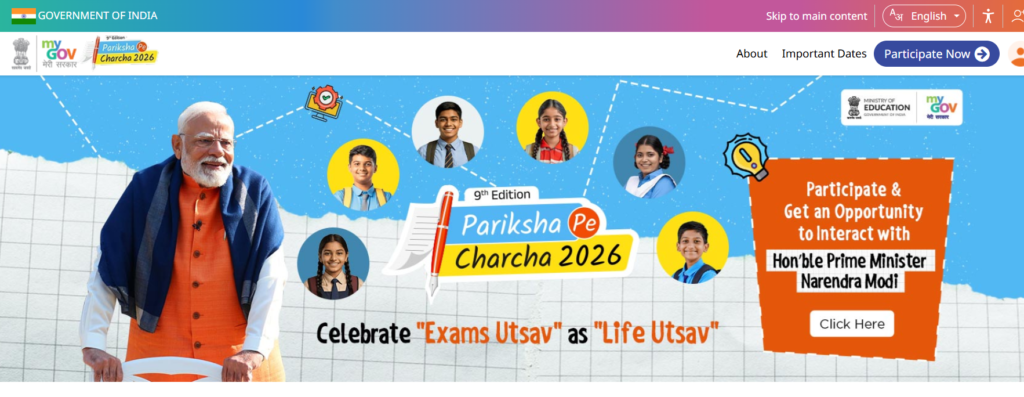 Step 2: On the homepage, Click on “Pariksha Pe Charcha 2026 Registration” or Participate Now Button link.