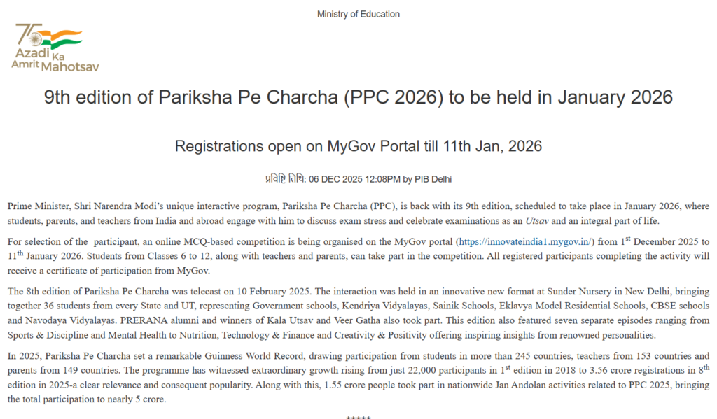 The 9th edition of Prime Minister Narendra Modi’s interactive program, Pariksha Pe Charcha (PPC), will be held in January 2026. The program brings together students, parents, and teachers from India and abroad to discuss exam stress and celebrate exams as an integral part of life.