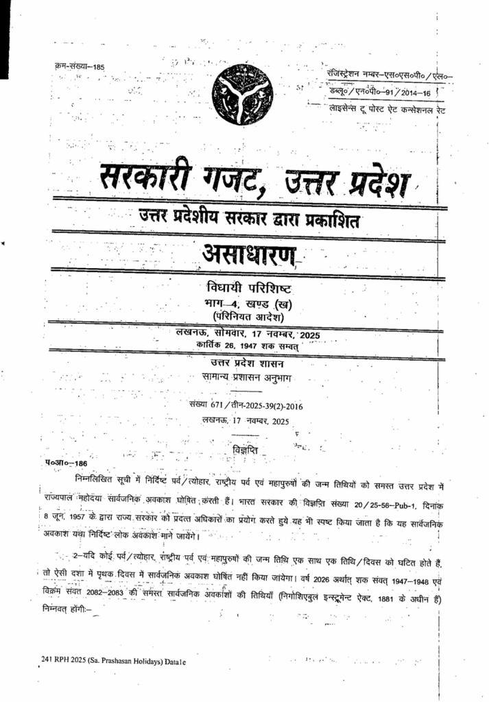 दिनांक: 17 नवम्बर, 2025 विषय: वर्ष 2026 (शक संवत् 1947-1948 एवं विक्रम संवत 2082-2083) के लिए सार्वजनिक अवकाश।